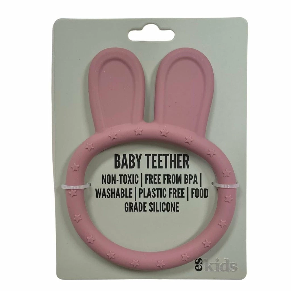 Dusty Pink soft silicone bunny teether ring. Easy to grip. Provides comfort to baby’s sensitive gums by gently massaging the gums to help in the eruption of teeth.
