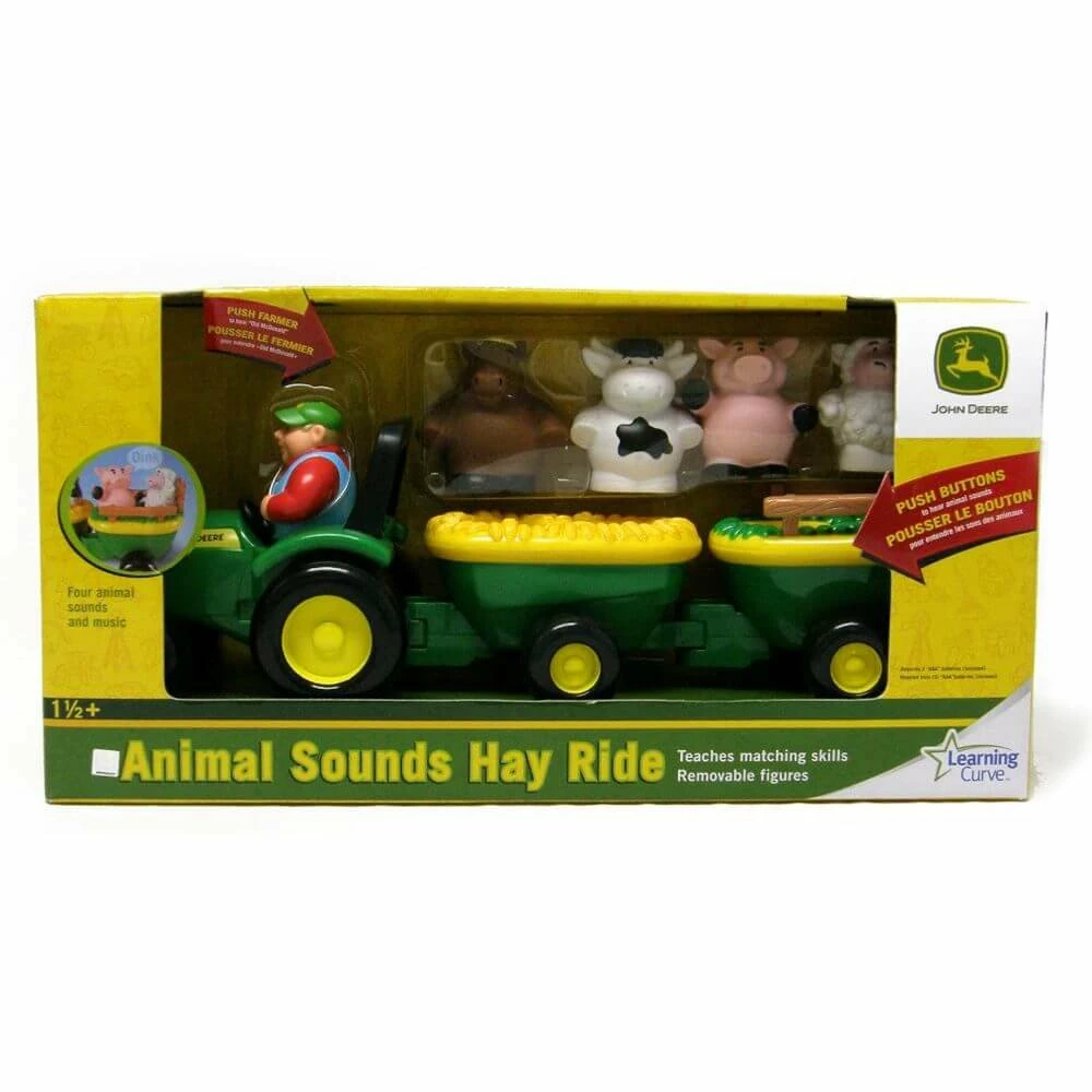 Hop aboard the John Deere Animal Sounds Hay Ride where you lead the way on your barnyard adventure. This classic John Deere toy features four animal sounds, music and removable figures. Encourages matching skills – match the animal to the picture on the seat. This toy plays “Old McDonald.” Requires 3 “AAA” batteries which are included. Age grade: 18mos.+