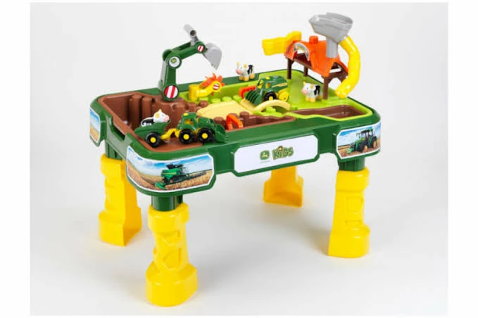 Play table with 2 large basins for sand and water with drawbridge, water bulkheads, water wheel and small plant basin.