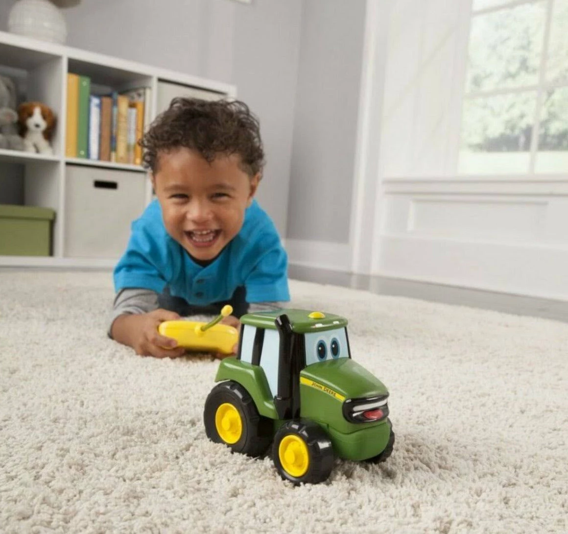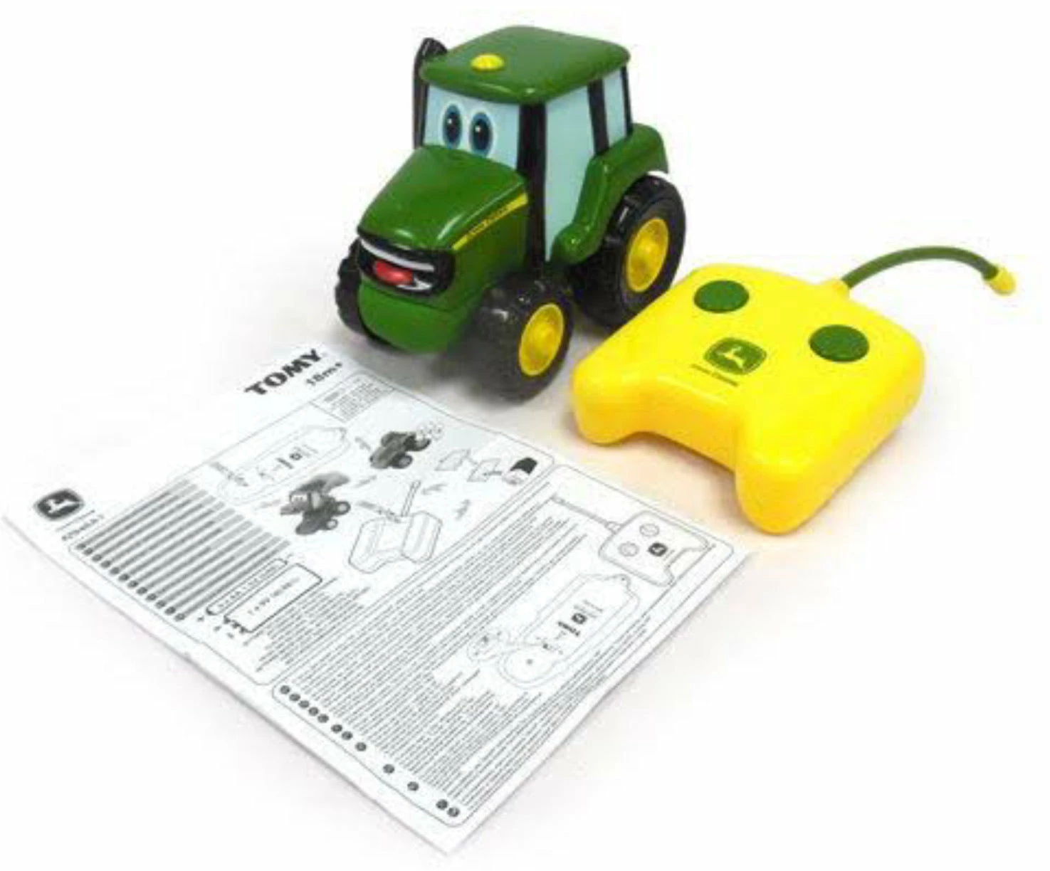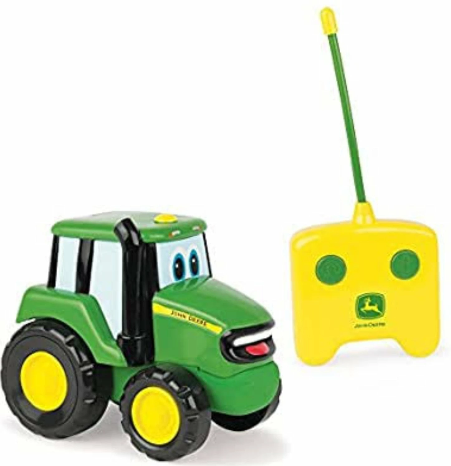 A child’s first remote control made out of soft touch plastic with easy forwards, backwards and spin around controls. Easy to use first remote control. The Johnny Tractor RC is the perfect first radio control for toddlers Featuring a simple, two-button controller, little ones will love to drive Johnny around while making him twist and turn. Johnny is durable enough to take bumps and bounces, yet soft enough that he won’t mark up walls or furniture. Features an auto shut-off to save batteries. Requires (3) AA and (1) 9V battery. Ages 18 months +. Produced by TOMY and officially licensed by John Deere. The Radio Controlled Johnny Tractor will get young farmers whizzing around at the push of a button or two This chunky John Deere vehicle has soft-touch surfaces with rounded edges for safe play. With its easy-to-use remote control, kids just have two buttons to press one to move forwards, the other to spin around.