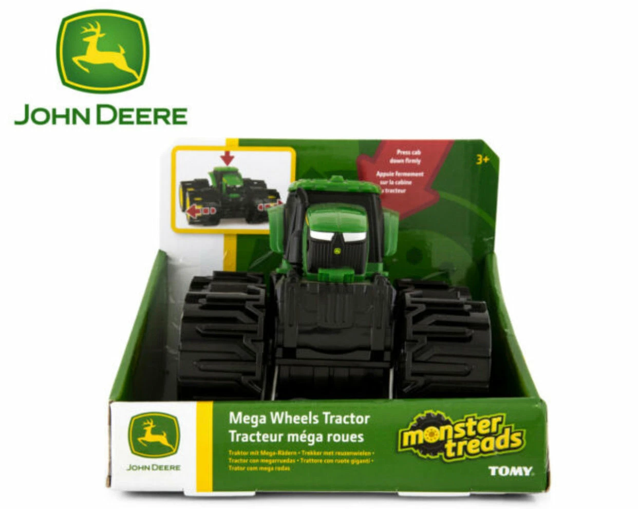 Conquer the trails with the John Deere Mega Wheels Tractor! Simply push down on the cab to expand all the tires then push again to retract them! No batteries required! Suitable for 3 years and over.