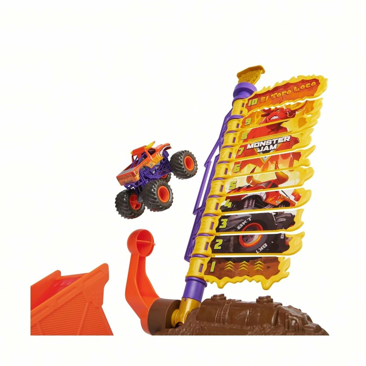 Reach new heights with the Monster Jam El Toro Loco Big Air Challenge! This playset is over 20 inches tall and features an exclusive El Toro Loco Monster toy truck, launcher and panel target. With 5 different positions on the launcher, aim high or go the distance with your other 1:64 scale monster trucks. Have your truck reach the top for explosive action and see the fireworks display just like in the World Finals XXI with your own monster trucks. Recreate the same stunts at home or turn the handle to see who can reach the furthest distance for extended play. This playset makes the perfect addition to your monster trucks collection for pretend play and imaginative fun! Bring the high-octane excitement of Monster Jam home with favorite characters like grave digger and el toro loco! Monster Jam toys like remote control car and trucks are the perfect gifts as girl and boy toys, ages 3 and up. Show off your skills with the Monster Jam El Toro Loco Big Air Challenge.