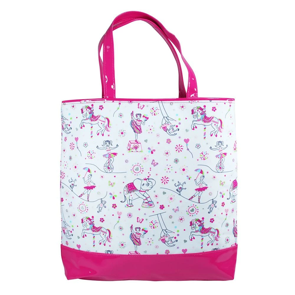 Carnival Carry Bag Large size tote bag with PU fabric. Durable and easy to clean and a very cute all-over print of horses ballerinas and elephants. Perfect activity carries a bag for swimming and the like.