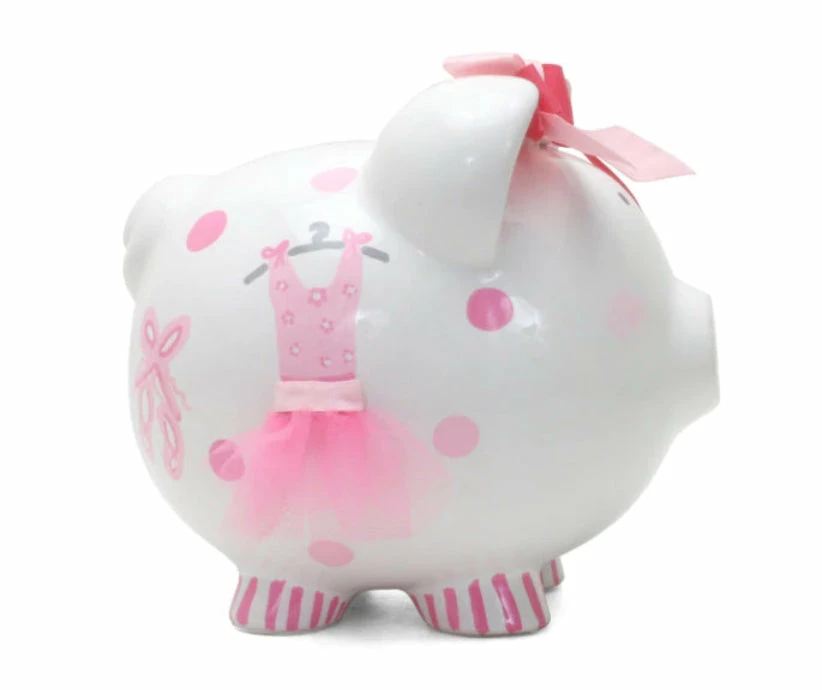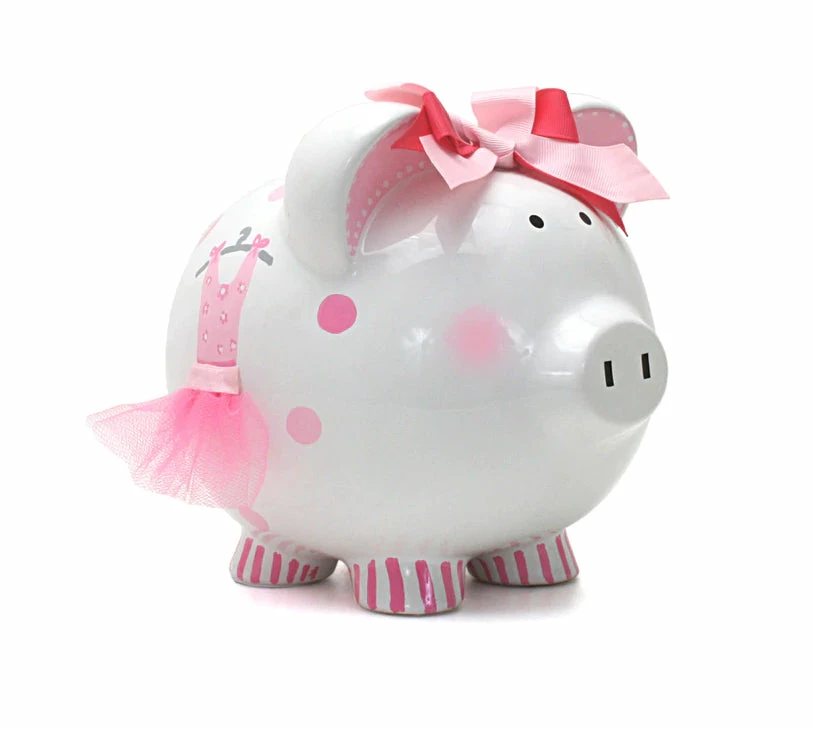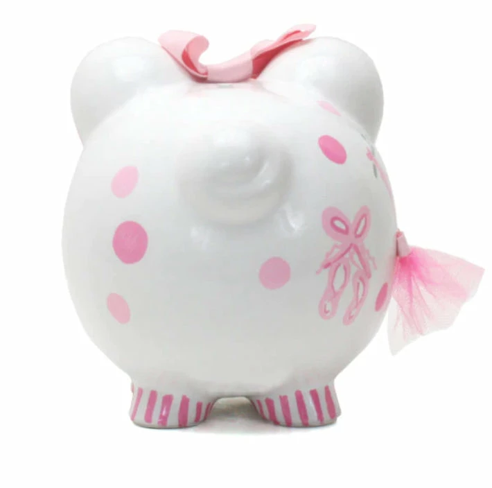 Our “Ava’s Tutu” Piggy Bank is one of our most unique piggy banks! What makes this piggy bank so unique is it’s 3D features and accents. Not only does this piggy bank have a bow on top, like many other banks, but this bank also has a real tutu attached to the side! Making this unique piggy bank the perfect gift for the little ballerina in your life! This piggy bank also has pink accents on the body and feet. All of our ceramic piggy banks are deep glazed, so that all of the essential color doesn’t wear off with repeated handling. To top things off, we add a shiny finish that keeps all the bright, vibrant colors locked in place.