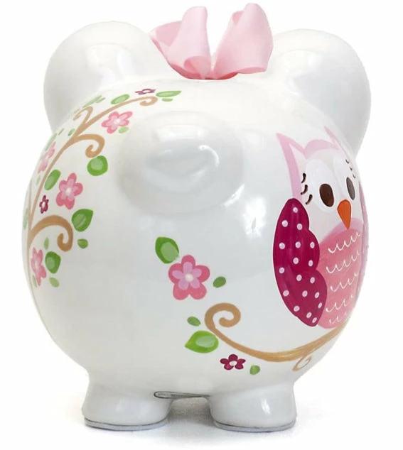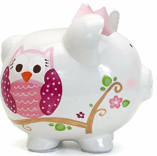 This piggy bank has pink accents on the body and feet. All of our ceramic piggy banks are deep glazed, so that all of the essential color doesn’t wear off with repeated handling. To top things off, we add a shiny finish that keeps all the bright, vibrant colors locked in place.