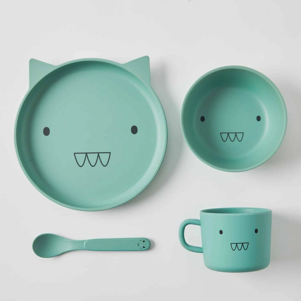 Make mealtime fun for little ones with this adorable eco-friendly bamboo fibre dinosaur 4 piece dining set! This bamboo dining set is the perfect alternative to traditional plastic or fragile dish-ware for kids. This set includes a child-sized plate, bowl, cup and spoon featuring a cute dinosaur face, which is guaranteed to make any little one smile.