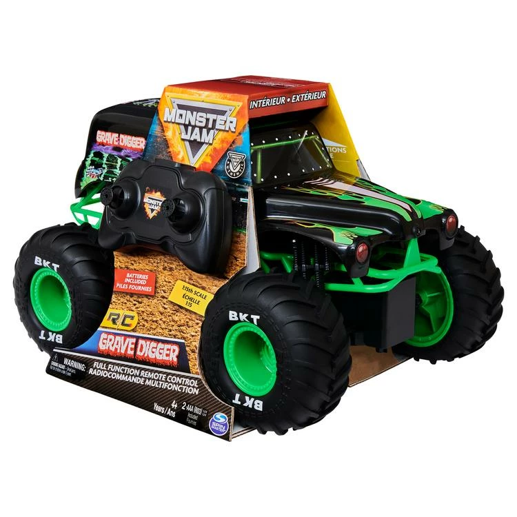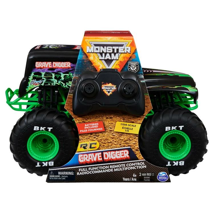 Take control of one of the most decorated Monster Jam trucks of all time! Introducing the all-new, official Monster Jam 1:15 scale Grave Digger RC! Drive this heavy-duty monster truck to the limit and perform epic stunts, crazy crashes and brutal bashes! Featuring 2.4 GHz, you can race up to 6 Monster Jam trucks with your friends and host your very own Monster Jam rally! And with a longer range, this USB-rechargeable truck will turn your world into a Monster Jam arena! This 1:15 scale Grave Digger RC is ready to run right out of the box and comes complete with batteries for the controller! Just flick the power switch and go! Use the convertible packaging to build a monster-sized ramp and launch right into the high-flying action! With a more detailed body featuring authentic BKT Tires and a look-alike chassis, this replica Grave Digger can handle almost anything you throw at it! The all-new Grave Digger RC is like driving the real thing! Perform high-octane stunts like big air, donuts, cyclones and more! You’ve never been closer to the action than with the all-new 1:15 scale Grave Digger RC!