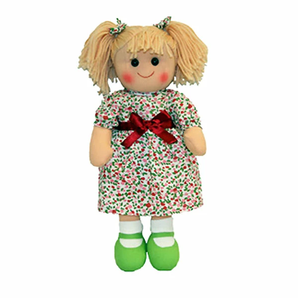 Jane is a cute rag doll wearing a red and green floral dress with red ribbon around her waist. She has floral bows in her pigtails in her woolly blonde hair. Clothing is removable and hand washable