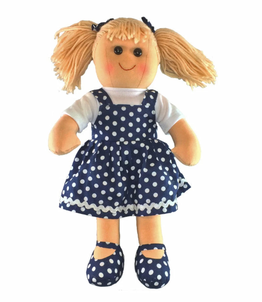 Harriet is a pretty ragdoll. She is dress in a navy polka dot dress, which she wears over a white long sleeve t-shirt. Her blonde hair is tied up in pigtails and clothes are removeable and washable. All new materials. Machine washable. Suitable for Ages 3+. Measures 14 inch / 35cm tall.