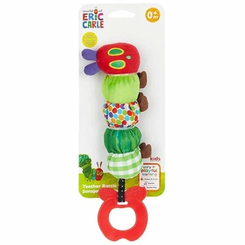 Soothing teether. Rattle and crinkle sounds. Multiple textures and graphic prints. Printed fabrics based upon original Eric Carle artwork. Soft, baby safe construction.