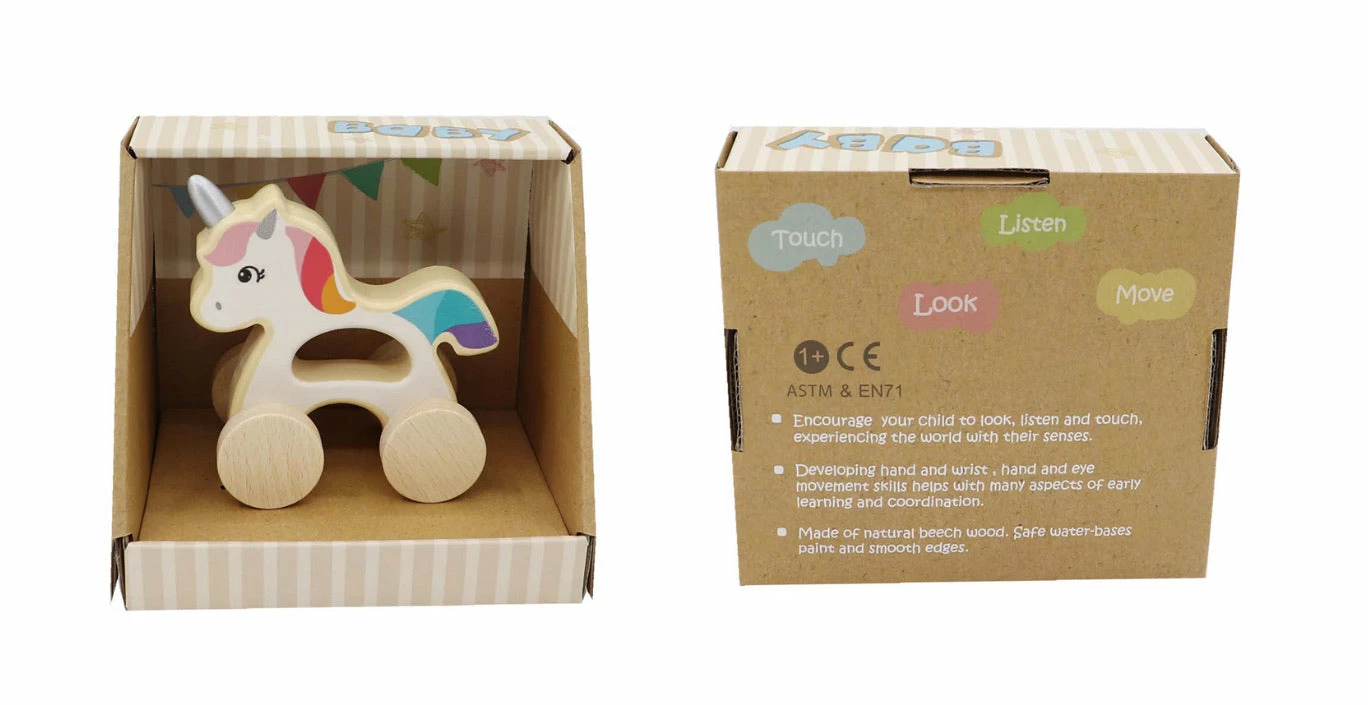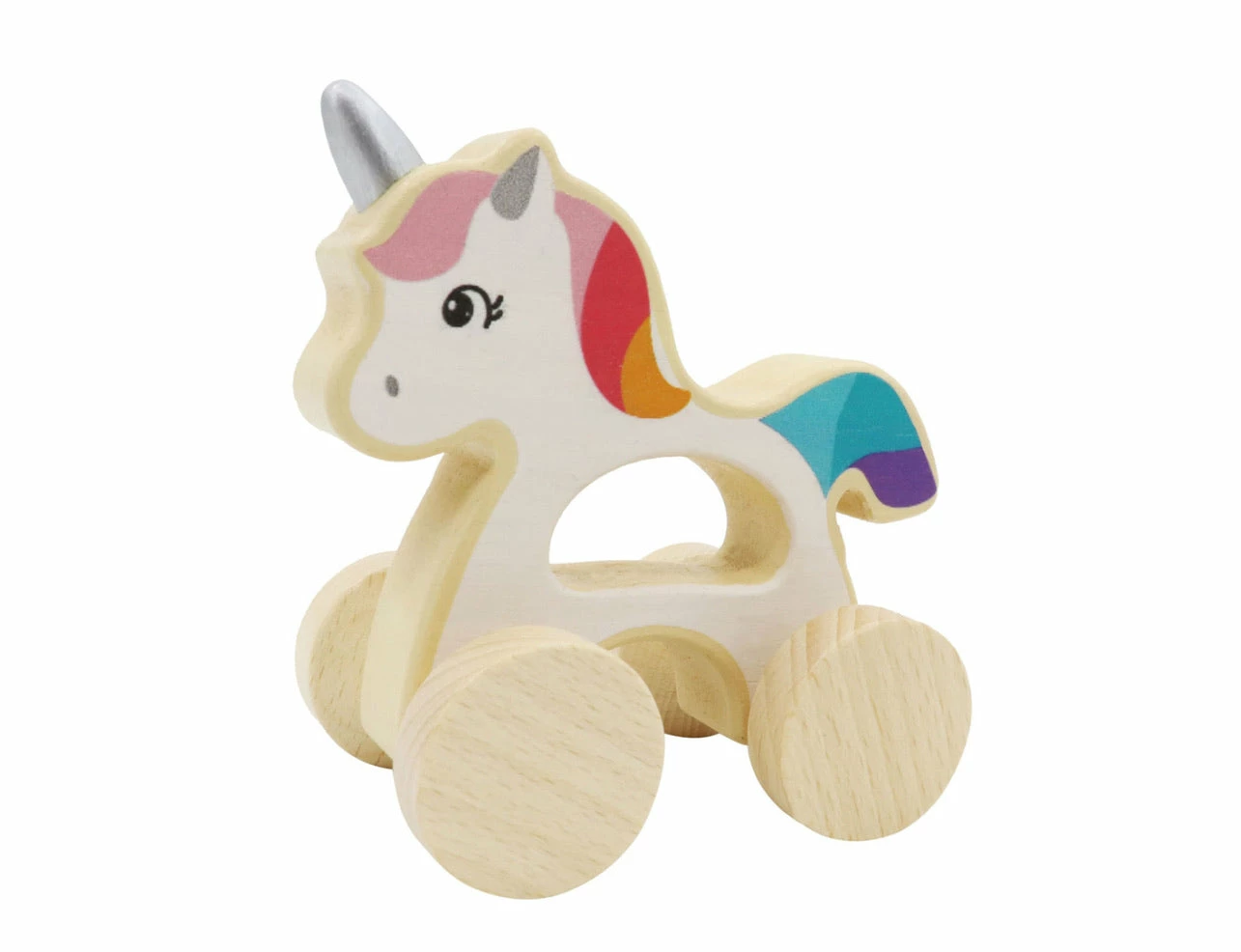 Adorable natural timber vehicle in the shape of a unicorn, decorated with a rainbow mane and tail. Solid wheels that glide along all surfaces. A great first car and will look so cute in a child’s room. Promotes fine motor skills. Paint used are non-toxic.